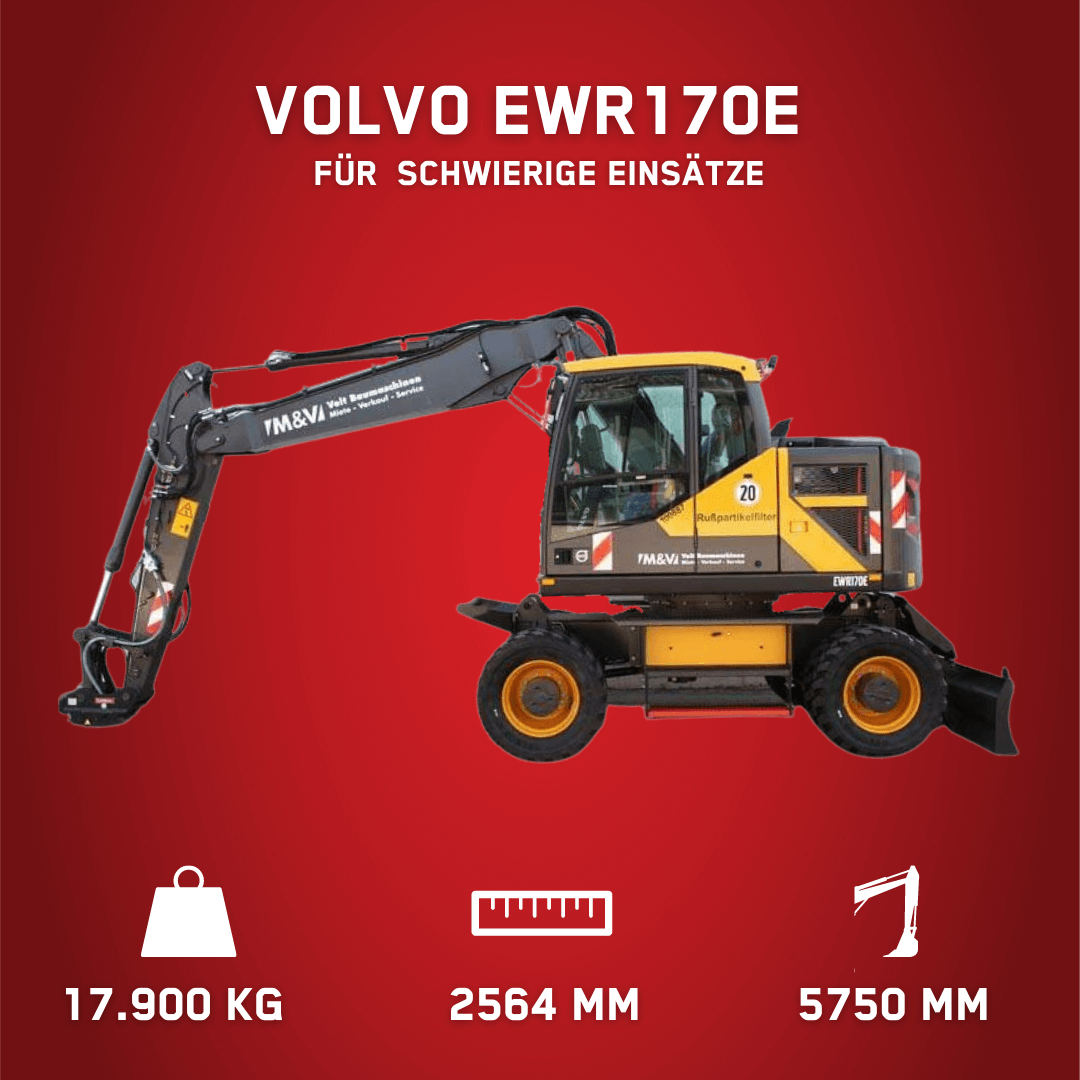 Dieses leistungsstarke Kraftpaket wurde dafür gebaut, um mit einer erstklassigen Effizienz und einer präzisen Kontrolle die höchste Produktivität zu erreichen! Unser Volvo EWR170E Mobilbagger hat nicht nur einen besonders kurzen Schwenkradius, tatsächlich ist es sogar der kürzeste Schwenkradius auf dem Markt! Dadurch hilft Ihnen unser Bagger auch dort, wo andere Maschinen bereits scheitern. Alle weiteren Informationen zum Volvo EWR170E Mobilbagger finden Sie hier.