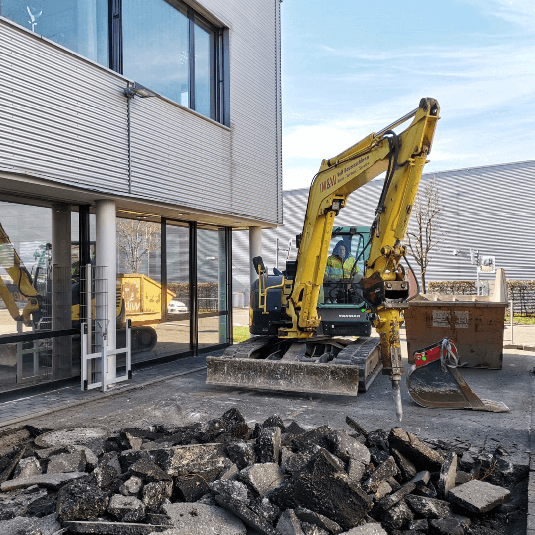 Die Firma Wildermuth nutzt einen unserer Yanmar Midibagger, um den Boden unmittelbar vor einem Gebäude aufzubrechen. Mit dem Zero-Tail-Swing-Bagger ist das kein Problem.