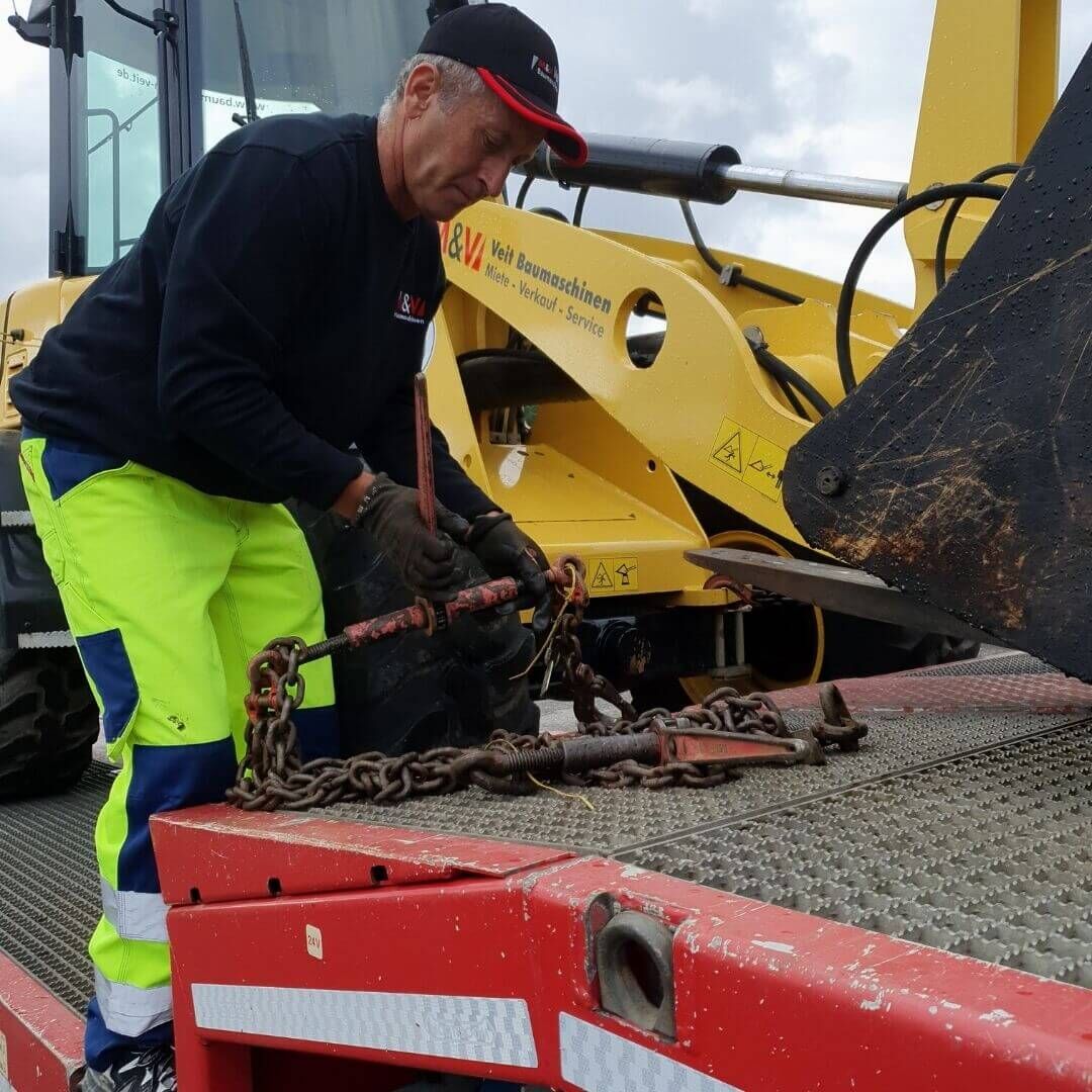 Die Mitarbeiter vom M&V Lieferservice kümmern sich gewissenhaft um die Ladungssicherheit unserer Mietmaschinen, sodass diese einwandfrei auf Ihrer Baustelle ankommen. Und auch nach dem Einsatz auf der Baustelle müssen Sie sich um nichts kümmern. Unsere Mitarbeiter holen die Baumaschine wieder ab und kümmern sich, auch für den Rückweg, um die Transportsicherung.