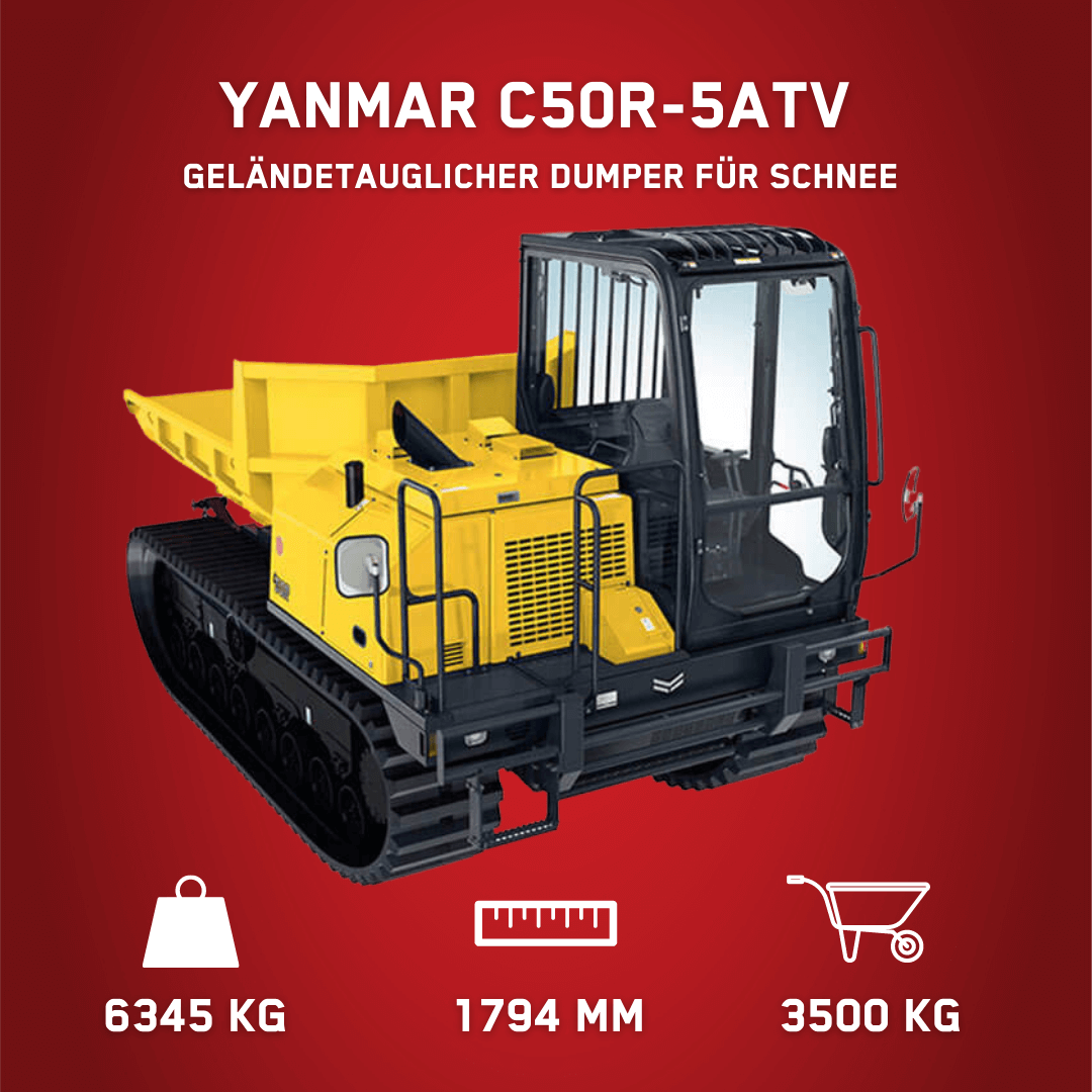Wenn Ihre Baumaschine nicht auf die Baustelle gelangen kann, ist sie nutzlos. Mögliche Gründe können niedrige Durchfahrten, Schnee, aufgeweichte Böden oder starke Steigungen sein. Der Yanmar C50R-5ATV Raupendumper meistert all dies. Seine Länge von 4.650 mm macht Wendemanöver einfach. Mit seiner großen Bodendistanz gelangt der geländetaugliche Dumper an Orte, die andere Maschinen nicht erreichen.