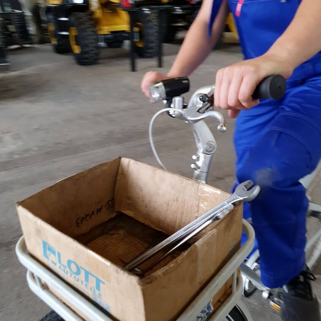 Bei einem Gelände mit rund 32.000 qm braucht es manchmal etwas länger, um von A nach B zu kommen. Um schneller ans Ziel zu gelangen, nutzen unsere Mitarbeiter deshalb gerne unsere Betriebsfahrräder. So können auch kleinere Lasten, wie Werkzeug oder Pakete, einfach transportiert werden.