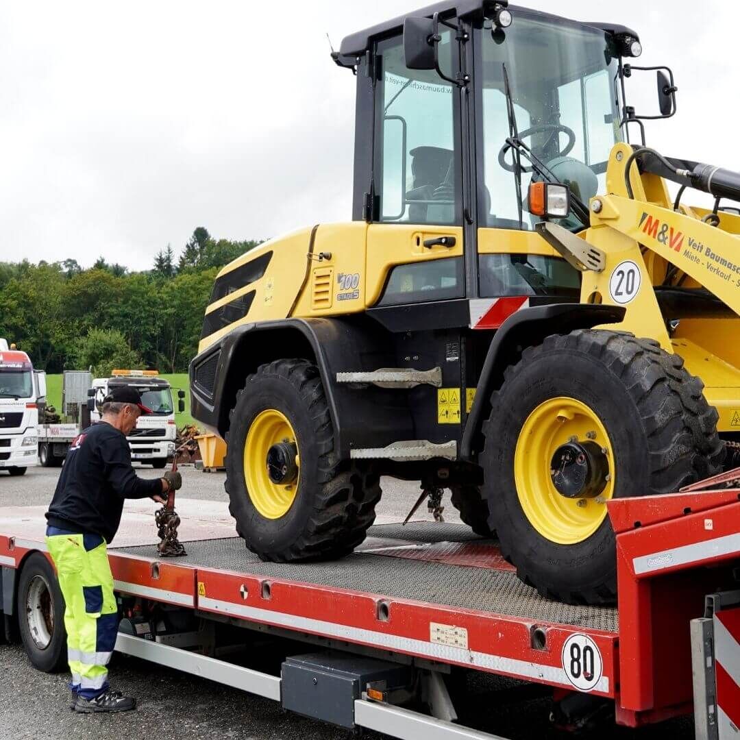 Damit die Baumaschinen sicher und pünktlich am Einsatzort ankommen, bieten wir unseren Kunden einen vollumfänglichen Lieferservice. Mit eigener Disposition können unsere Mitarbeiter zu jeder Zeit verlässliche Aussagen über die Verfügbarkeit treffen. Unsere Fachkräfte in der Werkstatt prüfen die Maschinen vor der Auslieferung nochmal auf Herz und Nieren. Und unsere Fahrer kümmern sich um die Ladungssicherung und pünktliche Auslieferung der Maschinen.