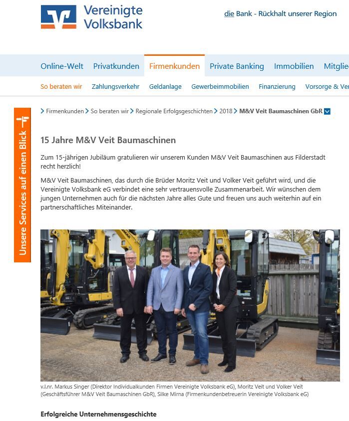 Die Vereinigte Voksbank eG und M&V Veit Baumaschinen verbindet eine sehr vertrauensvolle Zusammenarbeit.