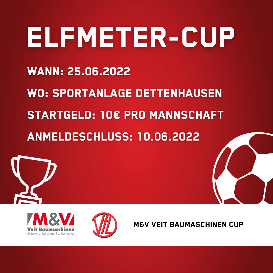 Am Samstag, den 25. Juni 2022 findet das Elfmeter-Turnier rund um den M&V Veit Baumaschinen-Cup statt. Teilnehmen können Männer-, Damen oder gemischte Mannschaften. Eine Mannschaft besteht aus einem Torwart und vier oder fünf Schützen.