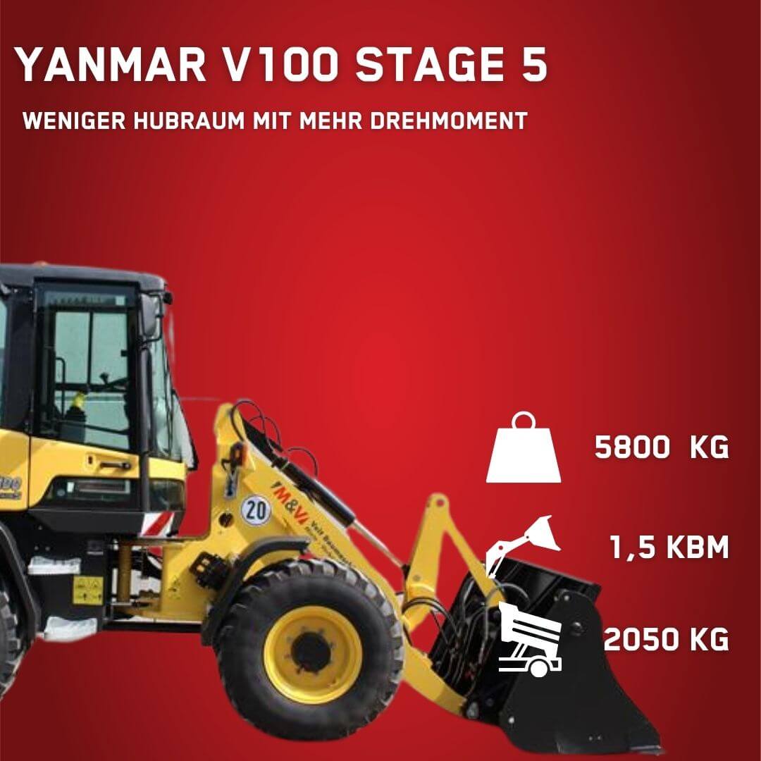 Das Stage 5 steht für die neue Motorentechnologie, die der Radlader mit sich bringt. Der hydrostatische Antrieb bietet mehr Arbeitsleistung bei geringerem Spritverbrauch. Mit dem Yanmar V100 Stage 5 lässt es sich wirtschaftlich und effizient arbeiten. Er ist vielseitig einsetzbar, ob im Garten- und Landschaftsbau oder Hoch- und Tiefbau, auf die Power kann man zählen. Zudem bietet der V100 durch seine Knicklenkung mit einem Lenkwinkel von 40 Grad eine hohe Manövrierfähigkeit und ist zuverlässig und stabil.