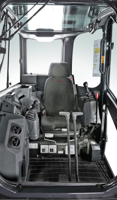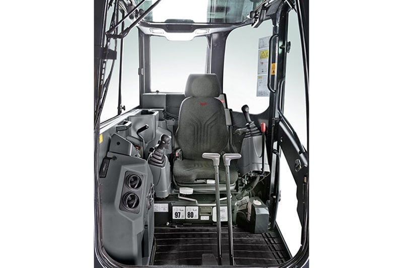 Yanmar hat der Bedienkonsole viel Aufmerksamkeit geschenkt, um den Komfort und dadurch auch die Produktivität zu erhöhen. Die neue Fahrerkabine ist sowohl breiter als auch länger und für ihre Klasse außergewöhnlich geräumig. Zudem ist es uns gelungen, den Geräuschpegel im Innenraum deutlich zu reduzieren. Der luftgefederte Sitz ist Standard und kann auf verschiedene Weise einzeln oder zusammen mit den Konsolen eingestellt werden, was sonst meist nur bei großen Baggern möglich ist. Dadurch kann der Bediener leicht seine optimale Arbeitsposition finden. Weitere Pluspunkte sind die integrierte Klimaanlage, ein verschließbares Aufbewahrungsfach für Dokumente sowie ein Radio mit USB-Anschluss.