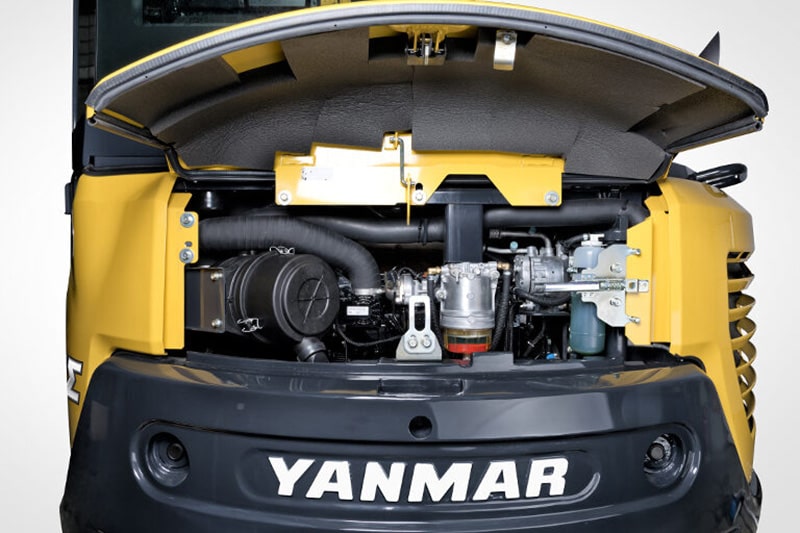 Der von Yanmar entwickelte fortschrittliche 53,5-kW-TNV-Motor erfüllt dank der gekühlten Abgasrückführung (AGR), die EU-Emissionsanforderungen der Stufe V – die Stickoxidemissionen werden dadurch drastisch reduziert. Darüber hinaus trägt ein Dieselpartikelfilter (DPF) zur Verringerung der Abgasemissionen bei. Zu den weiteren umweltfreundlichen Merkmalen gehört die Direkteinspritzung für eine sauberere Verbrennung sowie ein Common-Rail-System zur Feinabstimmung der Motorsteuerung. Darüber hinaus werden dank eines exklusiven Regenerationssystems die Ausfallzeiten infolge von Filterverstopfungen und Reinigungsmaßnahmen reduziert.