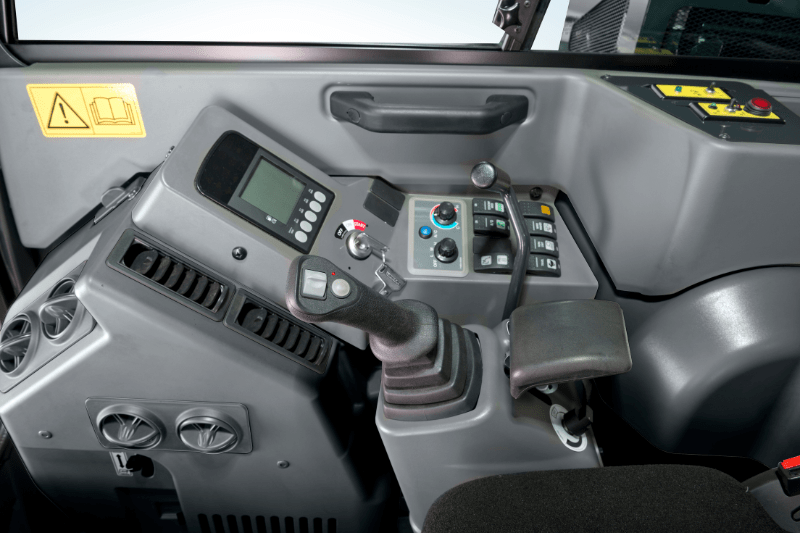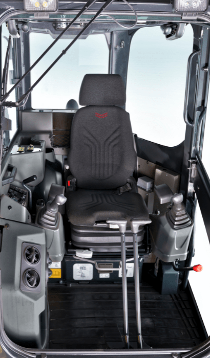 Auch der Komfort kommt bei unserem Yanmar SV100-2PB nicht zu kurz. Bereits die große Tür der Fahrerkabine erleichtert das Ein- und Aussteigen erheblich. Im großzügig ausgestalteten Innenraum haben erwartet Sie anschließend viel Platz und eine große Beinfreiheit, was sich besonders an langen und harten Arbeitstagen positiv bemerkbar machen wird. Dank der ergonomisch angeordneten Steuerhebel haben Sie zudem jederzeit eine optimale Bewegungspräzision. Zusätzlich lassen sich der breite luftgefederte Sitz mit integrierter Kopfstütze von Ihnen auf die optimale Arbeitsposition einstellen. Auch unerwünschte Geräusche und Vibrationen werden so stark abgeschottet, dass sie innerhalb der Fahrerkabine sehr viel geringer wahrgenommen werden und so nicht weiter stören.