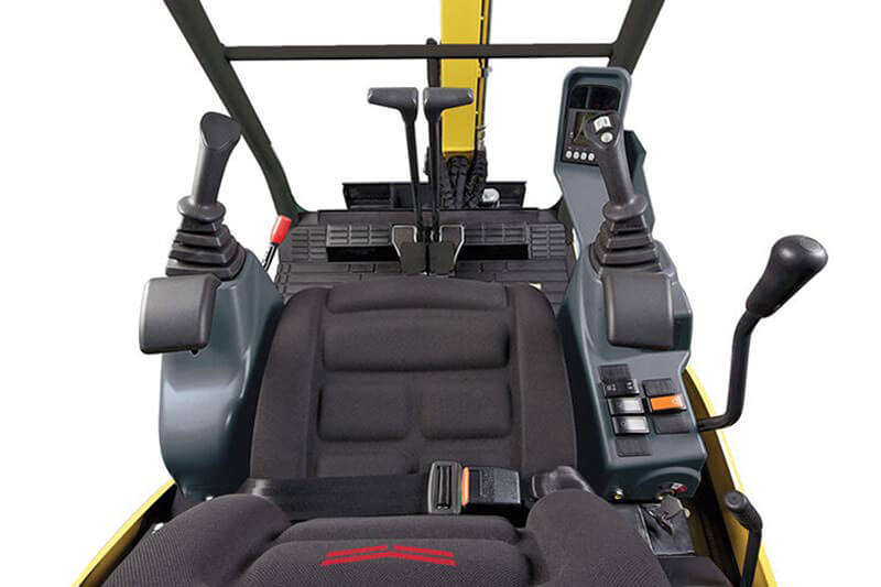 Alle Bedienelemente sind bequem erreichbar rechts neben dem Sitz angeordnet. Die intuitive, digitale Bedienschnittstelle sorgt für eine übersichtliche Bedienung und Wartung und ist auch von außen gut einsehbar. Der breite Einstieg erleichtert das Auf- und Absteigen. Eine hervorragende Luftzirkulation sorgt auch bei hohen Temperaturen für angenehmen Betrieb. Außerdem bietet der SV16 für seine Klasse die vielleicht größte Kabine auf dem Markt. Dadurch genießen auch größere Fahrer viel Beinfreiheit. Der Sitz ist verstellbar. Das schnell bedienbare Planierschild vereinfacht Planierarbeiten.