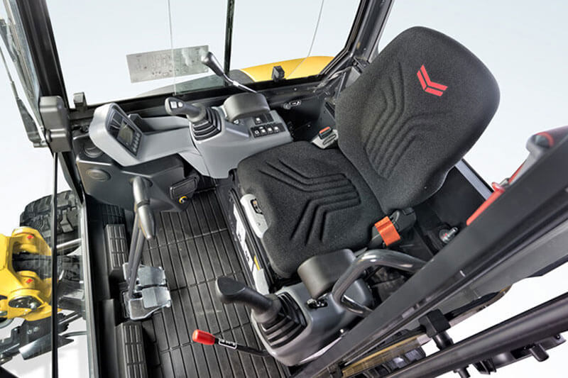 Die Kabine des kompakten Baggers ist besonders groß. Der geräumige Innenraum sorgt für ein hohes Maß an Bewegungsfreiheit und Fahrkomfort – und damit für ein ermüdungsfreies Arbeiten. Auch der Einstieg ist entsprechend geräumig und ermöglicht dem Fahrer einen leichten Zugang. Alle Bedienelemente sind für den Fahrer leicht zugänglich auf der rechten Seite angeordnet; die digitale Bedienerschnittstelle ermöglicht eine übersichtliche Bedien- und Wartungsplanung.