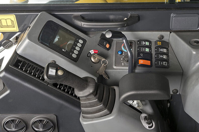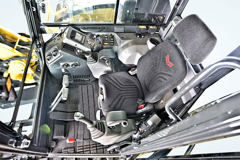 Der großzügig bemessene Innenraum ermöglicht ein ermüdungsarmes Arbeiten und trägt dadurch zur Steigerung der Produktivität bei. Besonderes Augenmerk wurde auf den Bedienerkomfort gelegt. Der luftgefederte Sitz mit Kopfstütze ist für eine Maschine dieser Klasse außergewöhnlich komfortabel. Weitere Pluspunkte sind die verstellbaren Handgelenkstützen, leichtgängige breite Fahrpedale und hydraulische Steuerhebel. Darüber hinaus bieten die Steuerhebel eine hohe Bewegungspräzision, was an langen fordernden Arbeitstagen ein weiterer positiver Effekt ist.
