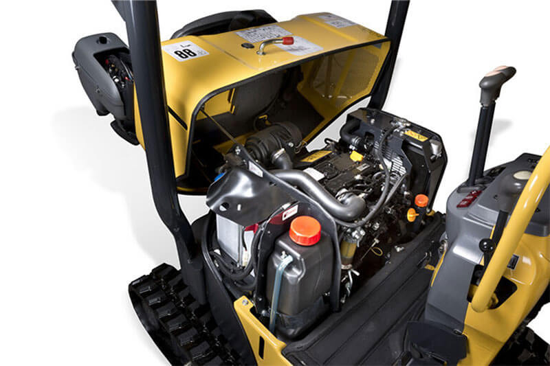 Der Dreizylindermotor ist angenehm leise und hat einen geringen Kraftstoffverbrauch. Zusammen mit dem fortschrittlichen Kühlsystem liefert er auch in tropischen Klimazonen eine hervorragende hydraulische Leistung ohne Überhitzung. Was seine Schubkraft (13,9 kN) und seine Reisskraft (5,8 kN) anbelangt, ist er mit anderen im Markt verfügbaren Maschinen vergleichbar, übertrifft sie jedoch deutlich mit seiner Grabtiefe von 1.950 mm. Dank der zwei Pumpen mit variablem Durchfluss und Sicherungsschalter ist ein störungsfreies Arbeiten möglich. Auch die Axialkolbenpumpen bieten gegenüber den sonst üblichen Zahnradpumpen eine bessere Leistung. Der Umschalter für die zweite Fahrgeschwindigkeit ist serienmäßig und ermöglicht eine Fahrgeschwindigkeit der Maschine von bis zu 4 km/h.
