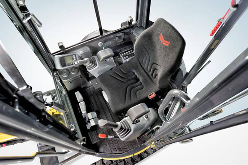 Yanmar hat sich eingehend damit befasst, wie die Arbeit für den Bediener so einfach und angenehm wie möglich gestaltet werden kann. Die ergonomisch ausgestattete Fahrerkabine bietet 360°-Sicht, erstklassige Sicherheitsfunktionen und ist gemäß ROPS und FOPS zertifiziert. Die bequem zugänglichen Steuerhebel reagieren fein und präzise. Die große Beinfreiheit und der niedrige Boden erhöhen den Sitzkomfort. Auch der leise Motor macht die Arbeit angenehmer. Optional ist ein gefederter, individuell einstellbarer ergonomischer Sitz mit hoher Rückenlehne und einem Sicherheitsgurt mit Aufrollautomatik erhältlich.