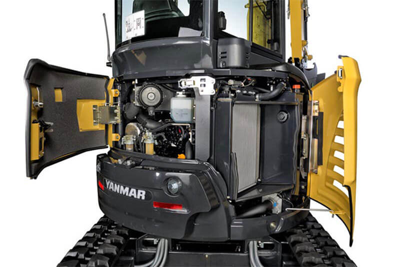 Der ViO23-6 Minibagger kennzeichnet sich durch Zuverlässigkeit, Haltbarkeit sowie Leistung unter anspruchsvollen Bedingungen und Arbeitsumgebungen aus – bei minimalem Wartungsaufwand. Alle Hauptkomponenten sind über die leicht zu öffnende Motorhaube oder die rechte Seitenabdeckung zugänglich, die für einen schnellen Zugriff an einem Scharnier angebracht ist. Die flache Bodenmatte erleichtert die Reinigung und Wartung zusätzlich. Zur Reduktion von Ausfallzeiten informiert die digitale Bedienschnittstelle von Yanmar den Fahrer in Echtzeit über den Status der Maschine, hebt Komponenten hervor, die geprüft werden müssen und bietet Serviceunterstützung. Robuste Stahlbleche und der umfassende Schutz der Zylinder tragen ebenfalls zur Verringerung der Ausfallzeiten und Gesamtbetriebskosten bei.