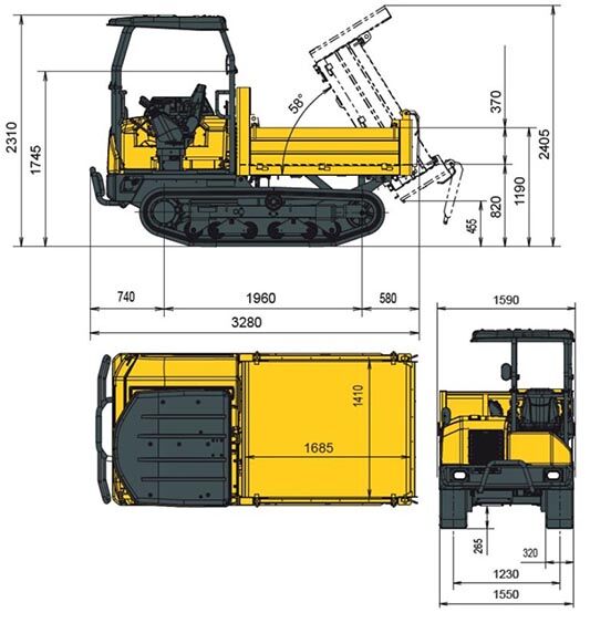 Sie können aus drei Kipprichtungen wählen: nach hinten und zu beiden Seiten. Damit können Ladungen bei geringem Platzbedarf seitlich in Gruben abgekippt werden. Durch den bemerkenswerten Kippwinkel von 58 Grad erfolgt dies sicher und in einem Arbeitsgang. Dank der Bodendistanz von 455 mm kann zudem schnell Entladen werden, wobei ein Kotflügel die Hydraulikkomponenten sowie den Fahrerbereich vor herabfallendem Material schützt.