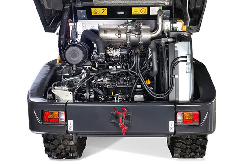 Der 4TNV98C Vierzylinder-Turbodieselmotor von Yanmar ist ein äußerst umweltfreundlicher Motor. Er glänzt außerdem mit langen Wartungsintervallen des DPF von 6.000 Stunden, seiner robusten und zuverlässigen Leistung und dem geringsten Kraftstoffverbrauch aller Motoren seiner Klasse. Der Motor erfüllt die EU-Abgasnorm Stufe V und ist der sauberste in seiner Kategorie. Gekühlte AGR und DPF gehören zur Standardausstattung, die Direkteinspritzung und Common-Rail-Technologie maximieren die Motorleistung.