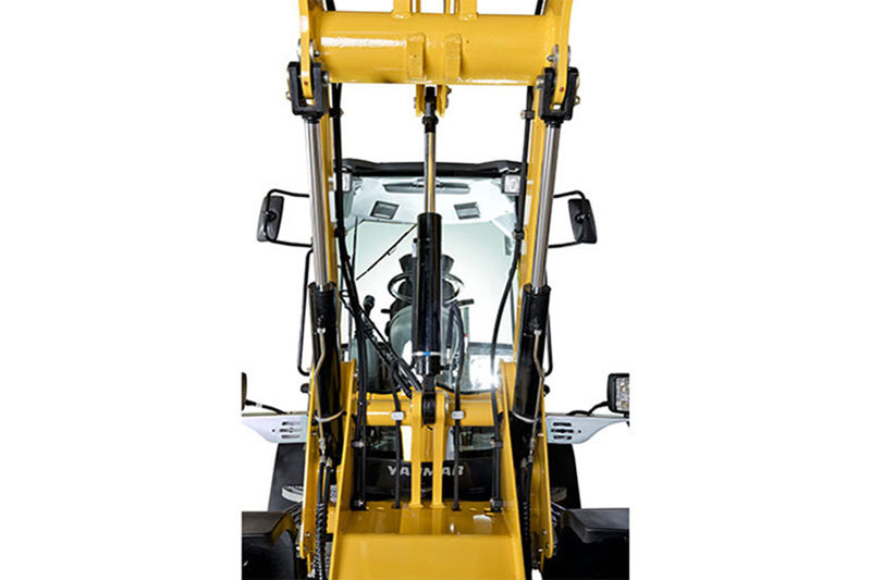 Dank der oszillierenden Hinterachse mit ihrem breiten Schwenkwinkel von 10 Grad berühren alle vier Räder zu jeder Zeit den Boden. Für zusätzliche Stabilität sitzt der Bediener immer parallel zum Anbaugerät. Im Gegensatz zu den Maschinen anderer Hersteller schwingt bei den Radladern von Yanmar nur die Hinterachse. Das bedeutet, dass sich das Gewicht der Maschine immer in die gleiche Richtung bewegt wie die Schaufel – was die Stabilität zusätzlich erhöht. Dadurch steigt wiederum der Druck auf den Boden beim Rückwärtsfahren.