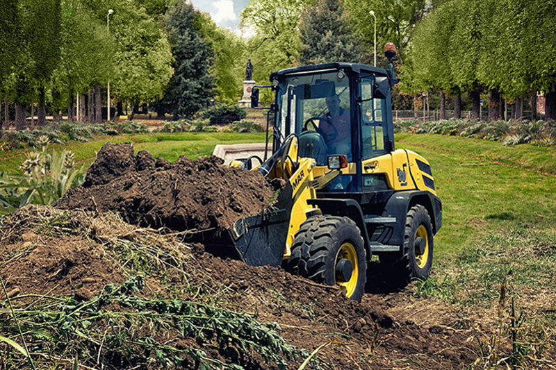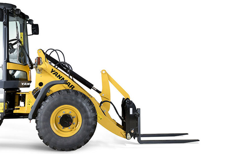 Das Radladermodell V80 von Yanmar ist ideal für Arbeiten auf engem Raum. Die Knicklenkung sorgt mit einem Einschlagwinkel von 40 Grad für bessere Manövrierfähigkeit. Die Schaufel kann selbst bei vollem Einschlagwinkel gerade auf die Ladung zubewegt werden. So können Sie auch auf engem Raum flexibel arbeiten. Eine oszillierende Hinterachse sorgt dafür, dass immer alle vier Räder Bodenkontakt haben und der Radlader so besonders stabil ist. Außerdem schwingt nur die Hinterachse, dadurch bewegt sich das Gewicht der Maschine immer in die gleiche Richtung wie die Schaufel.