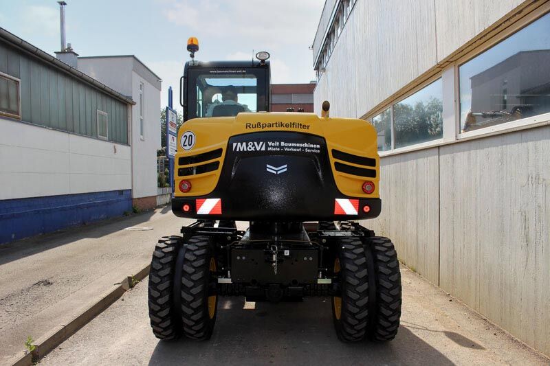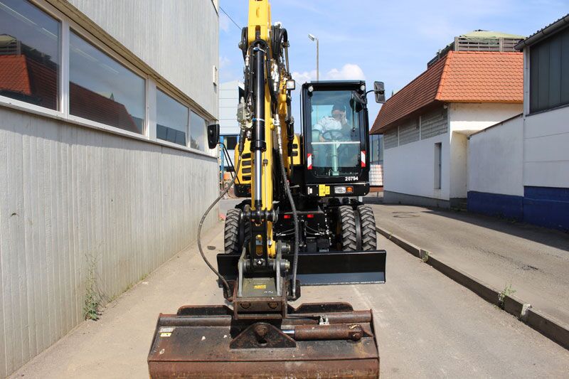 Unseren Mobilbagger können Sie hervorragend an Ihre Bedürfnisse anpassen. Beispielsweise lässt sich mit dem optional erhältlichen verlängerten Löffelstiel der Aushubradius erweitern. Sie können aber auch den Schwenkradius mit einem Circularausleger um ganze 46 % verringern. Gerade bei Arbeiten auf engem Raum wie in Städten erweist sich dies als probates Mittel, um mit den gegebenen Umständen ausgezeichnet zurecht zu kommen. Ist der Schwenkradius reduziert, benötigt der Wendekreis gerade einmal nur noch 2.960 mm! Damit schlägt er die Maschinen anderer Anbieter um nahezu das Doppelte!